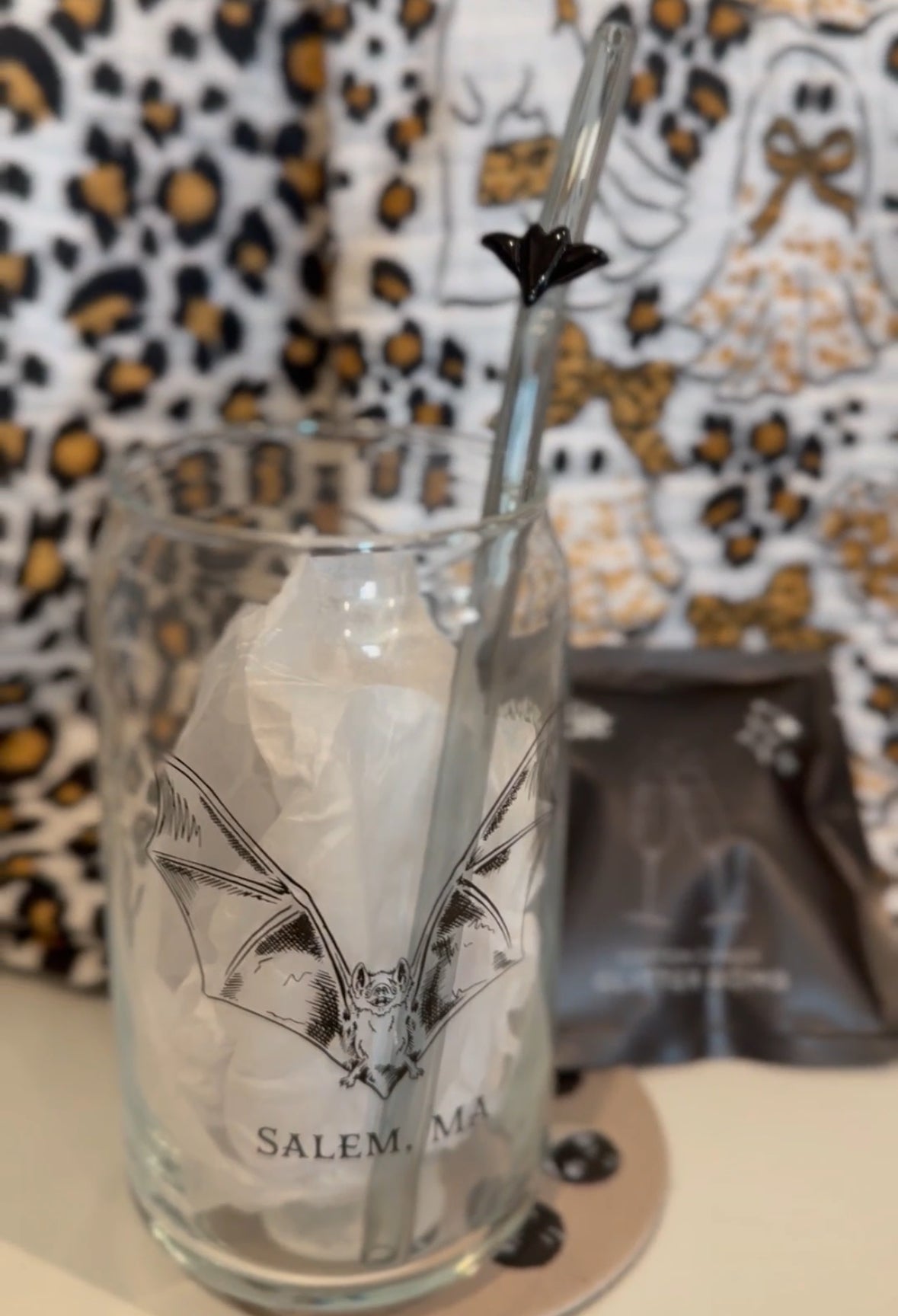 The Batty & Boujee Set is a curated Salem-inspired collection that brings together spooky elegance and everyday glam. From your bespoke bat glass and matching straw to the glitter bomb that transforms any drink into a potion, this kit is made for witches who sip in style. Bonus: the leopard-print ghostie towel ties it all together with cozy kitchen magic.