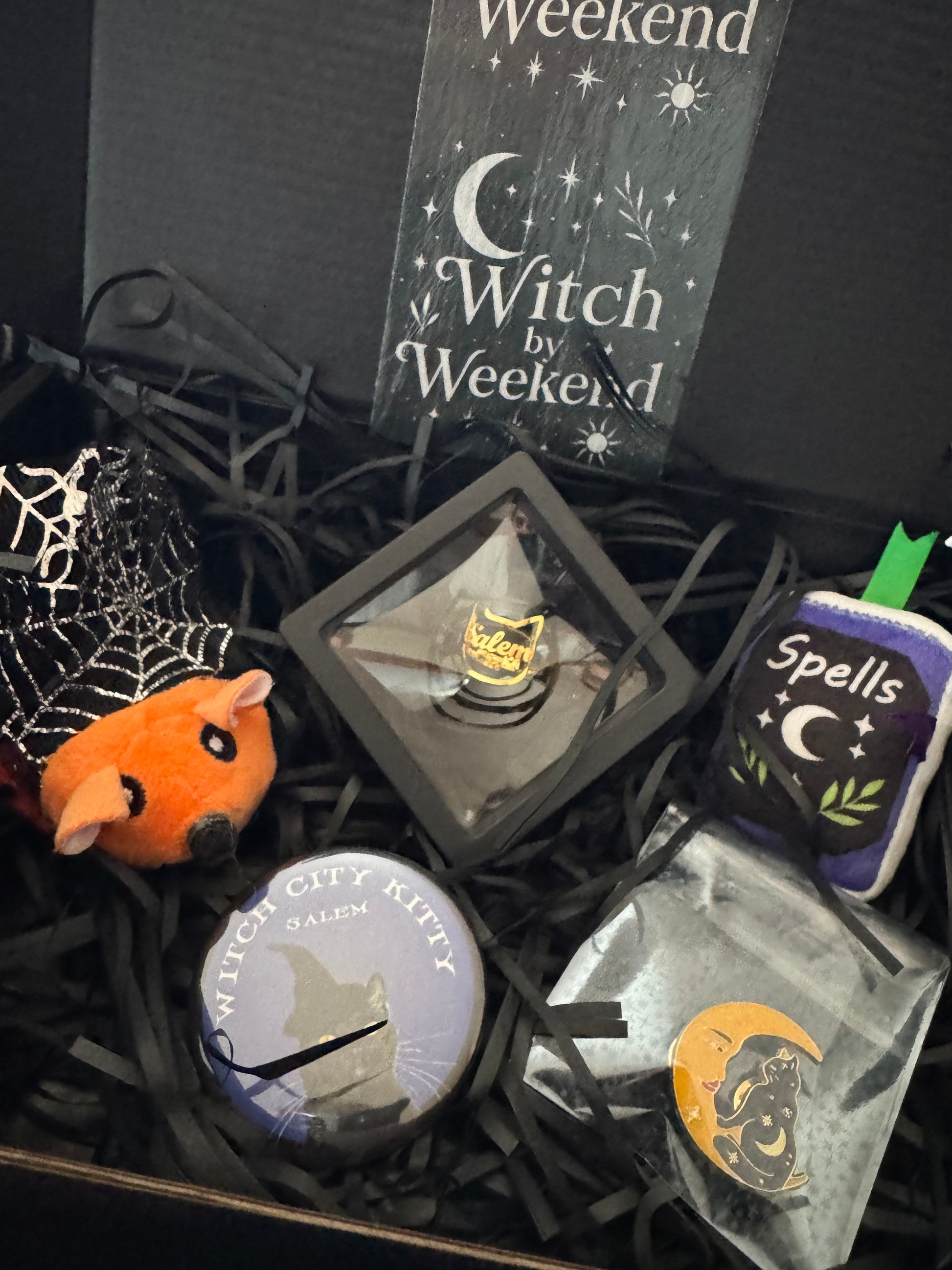 For the witchy cat (and their human) who deserves a little Salem magic! This purr-fectly curated box brings together treats for your familiar and iconic Witch City Bling treasures β all bundled in one enchanted package. β¨